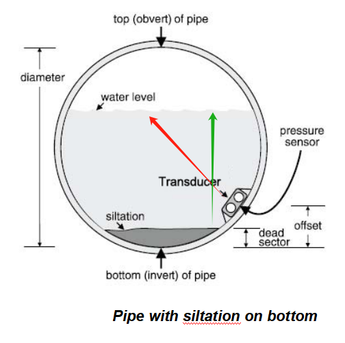 1 , for the pipe with siltation on the bottom, we have to install the sensor on the side of pipe. At this time, the liquid depth measured by the ultrasonic is shown in red, it is wrong.