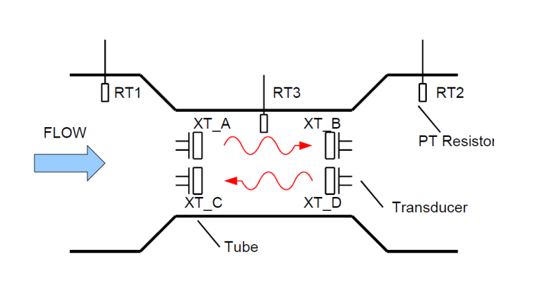 A transit time ultrasonic flow meter uses ultrasonic transducers that can both send and receive signal. The ultrasonic signal is transmitted between the transducers through the fluid that pass through the flow meter. The transducers are organized so that the sound velocity will interact with the flow velocity. The sound propagation time between the transducers is measured in both directions. If there is no fluid motion the two times are ideally equal but if there is fluid velocity present the