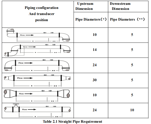 A piping system that is completely full of liquid when measurements are being taken. The pipe may become completely empty during a process cycle – which will result in an error code being displayed on the flow meter while the pipe is empty. Error codes will clear automatically once the pipe refills with liquid. It is not recommended to mount the transducers in an area where the pipe may become partially filled. Partially filled pipes will cause erroneous and unpredictable operation of the meter. A piping system that contains lengths of straight pipe such as those described in Table 2.1.