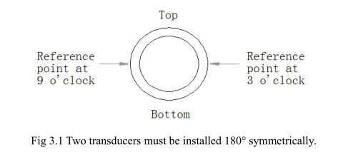 Two transducers called A and B transducer, A is transmitting transducer and B is receiving transducer, they must be installed 180° symmetrically in order to have a more accurate measuring, shown as Fig 3.1.