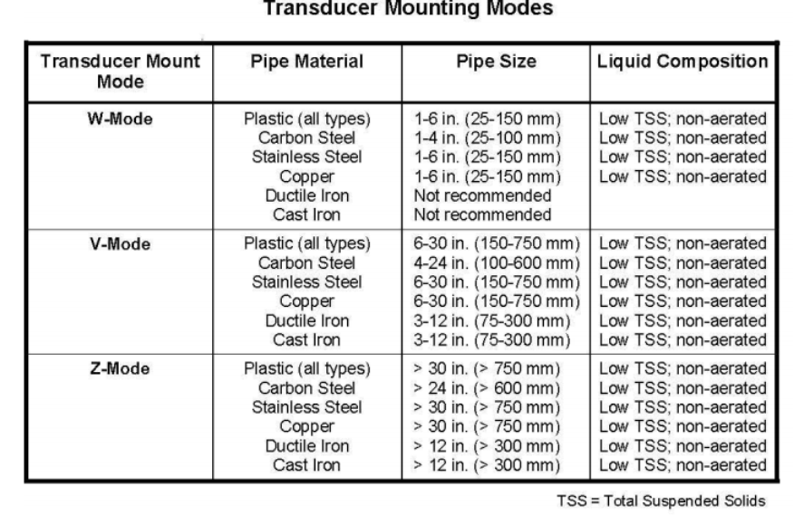 Transit time ultrasonic clamp-on transducers are clamped on the outside of a closed pipe at a specific distance from each other. The transducers can be mounted in V-mode where the sound transverses the pipe two times, W-mode where the sound transverses the pipe four times, or in Z-mode where the transducers are mounted on opposite sides of the pipe and the sound crosses the pipe once. For further details, reference pictures located under Table 2.2. The appropriate mounting configuration is based on pipe and liquid characteristics. Selection of the proper transducer mounting method is not entirely predictable and many times is an iterative process. Table 2.2 contains recommended mounting configurations for common applications. These recommended configurations may need to be modified for specific applications if such things as aeration, suspended solids or poor piping conditions are present. W-mode provides the longest sound path length between the transducers – but the weakest signal strength. Z-mode provides the strongest signal strength – but has the shortest sound path length. On pipes smaller than 3 inches [75 mm], it is desirable to have a longer sound path length, so that the differential time can be measured more accurately.