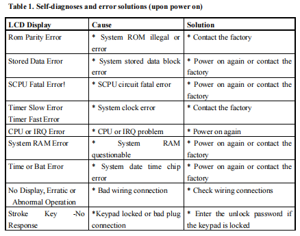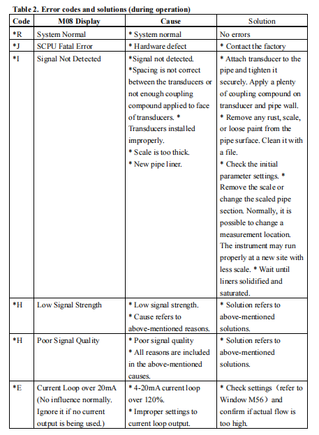 The TF1100 ultrasonic flow meter has advanced self-diagnostics functions and displays any errors in the upper right corner of the LCD via definite codes in a date/time order. Hardware error diagnostics are usually performed upon each power on. Some errors can be detected during normal operation. Undetectable errors caused by incorrect settings and unsuitable measurement conditions can be displayed accordingly. This function helps to detect the errors and determine causes quickly; thus, problems can be solved in a timely manner according to the solutions listed in the following tables. Errors displayed in the TF1100 are divided into two categories: Table 1 is for errors displayed during self-diagnostics upon power on. “* F” may be displayed on the upper left corner of the screen after entering the measuring mode. When this occurs, it is necessary to power on for self-diagnostics once again to detect and solve possible errors using the table below. If a problem still exists, please contact the factory or the factory’s local representative for assistance. Table 2 applies when errors caused by incorrect settings and signals are detected and are announced by error codes displayed in Window M07.