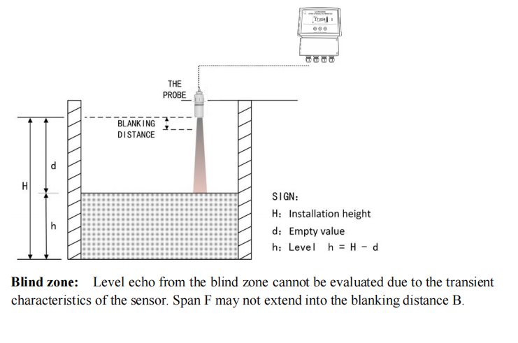 The probe is mounted on the top of the flume, and ultrasonic pulse is transmitted by the probe to the surface of the monitored material. There, they are reflected back and received by the pro be. The host measures the time t between pulse transmission and reception. The host uses the time t (and the velocity of sound c) to calculate the distance d between the sensor bottom and the monitored liquid surface: d = c •t/2. As the host knows the installation height H from parameters setting, it can calculate the level as follows: h = H – d.