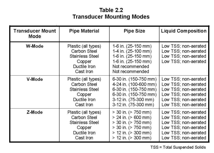 The following information is required before programming the instrument. Note that much of the data relating to material sound speed, viscosity and specific gravity are preprogrammed into the TF1100 flow meter. This data only needs to be modified if it is known that a particular liquid data varies from the reference value. Refer to Part 3 of our manual for instructions on entering configuration data into the TF1100 flow meter via the meter keypad. Transducer mounting configuration. See Table 2.2.